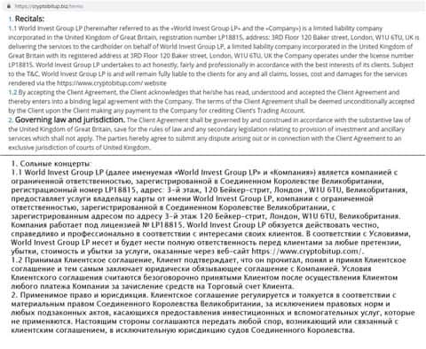 К тому же вообще не ясно, что за смысл прикрываться лицензиями других стран, если сайт CryptoBit принадлежит британской компании World Invest Group LP, и по договору все отношения между сторонами также регулируются по правилам Великобритании. Но вот лицензии британского регулятора FCA шарага как раз не имеет.