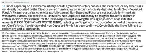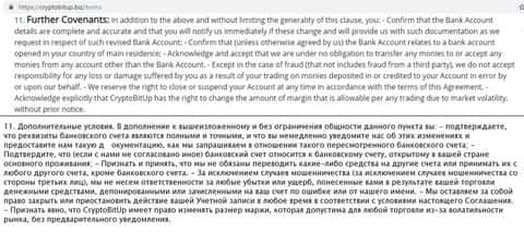 Интересно, что деньги, появляющиеся на счету клиента шараги Крипто Бит, могут ему не принадлежать. Такой пункт жулье включило в свой договор. То есть наивный лопух, увидевший прибыль на своем счете, и не изучивший соглашение, кстати представленное специально на иностранном языке, даже не поймет, что этих денег ему не увидеть ни при каких условиях.