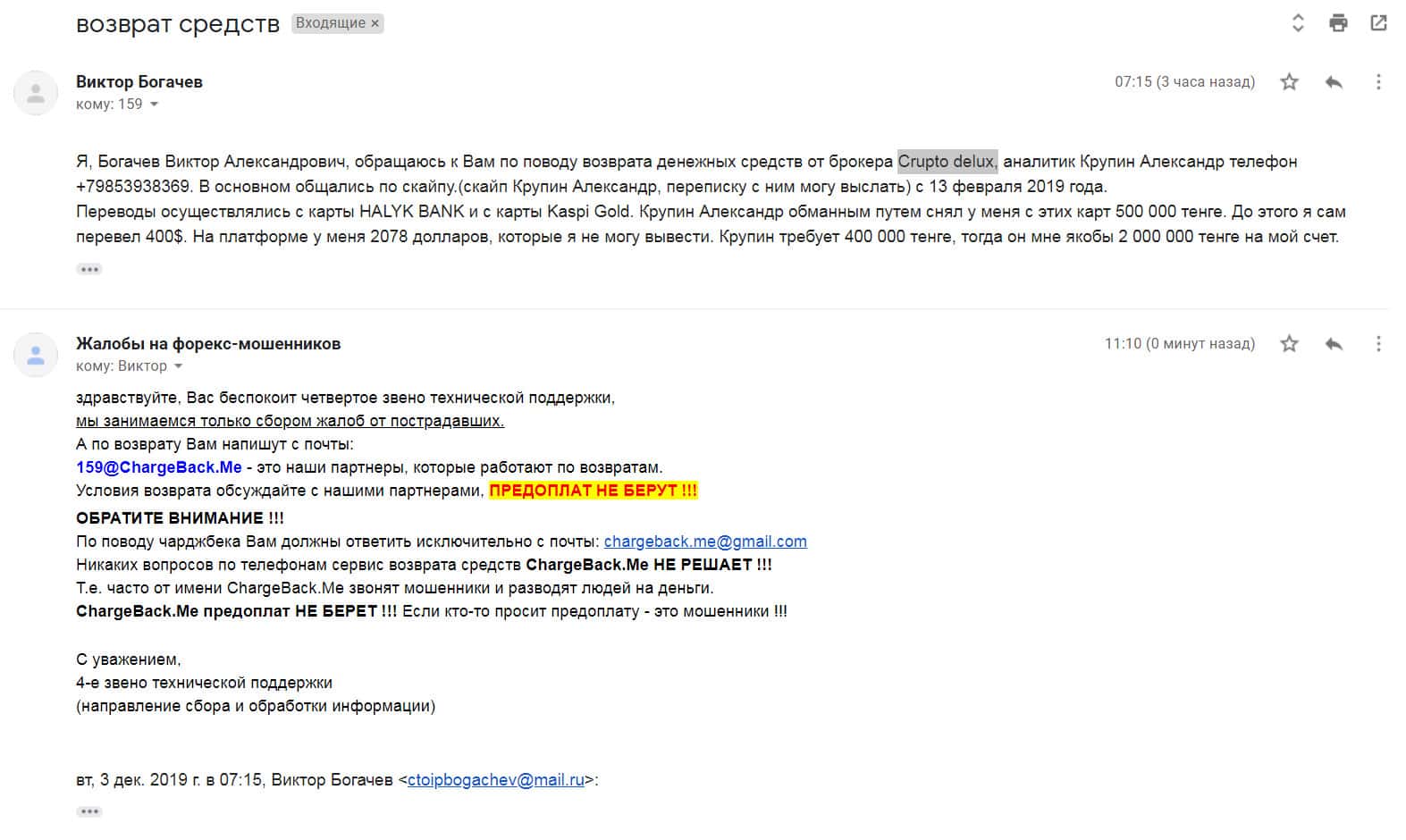 Клиент аферистов CryptoDeluxe написал в поддержку с просьбой вернуть его деньги, которые у него отобрали мошенники. Виктору Богачёву дают понять, что это аферисты и пытаются объяснить, что не нужно переводить больше никаких средств жуликам, иначе на этом они не остановятся и будут просить всё больше и больше, пока не отберут всё.