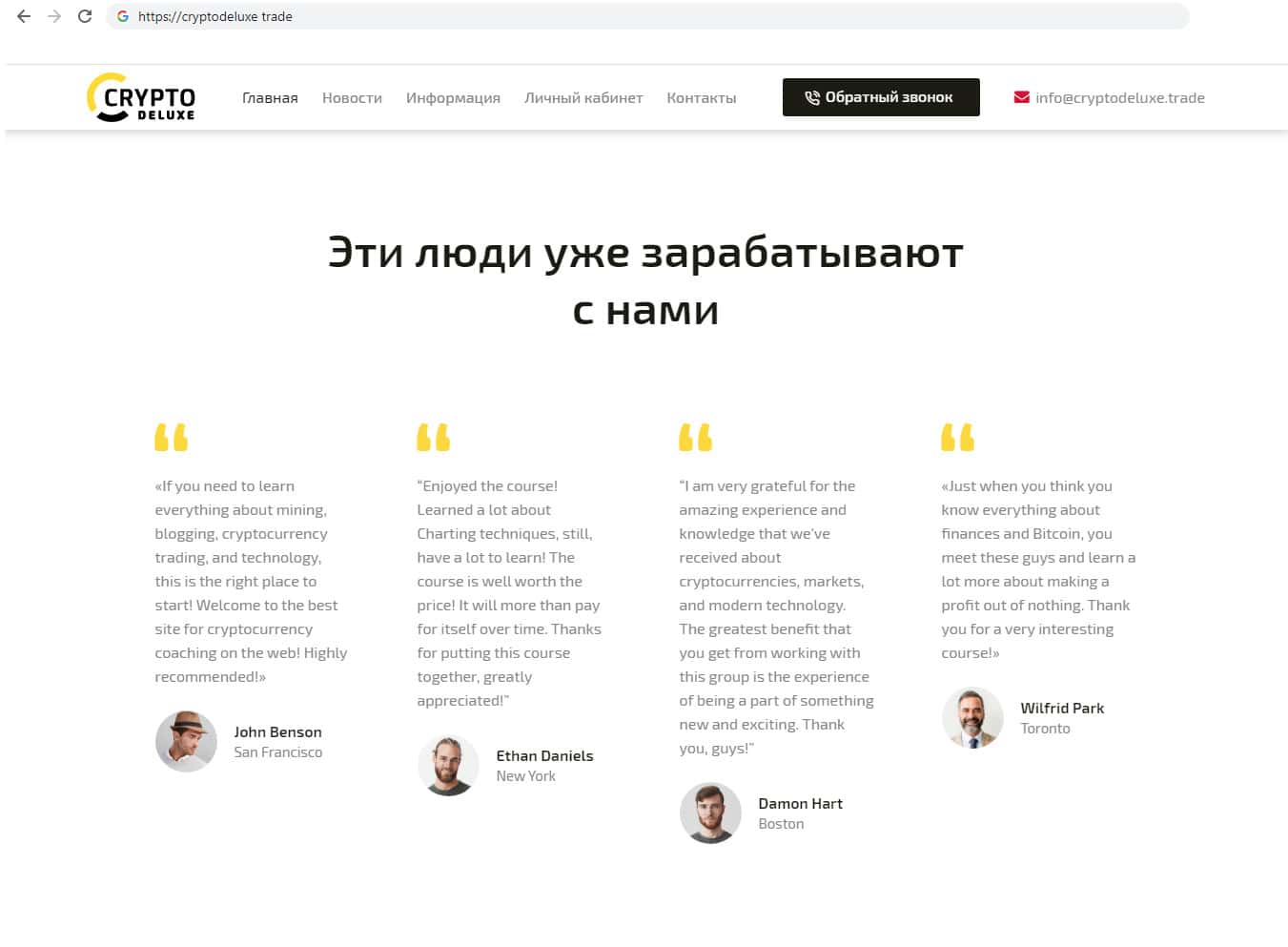 Далее нам предоставляют список каких то людей с фотографиями, где указанно, что они уже очень хорошо зарабатывают. Но почему то на русскоязычном сайте ни одного русскоязычного трейдера. Так же неизвестно что это за люди и их ли это фотографии, может люди даже не знают, что их фото используют мошенники CryptoDeluxe.