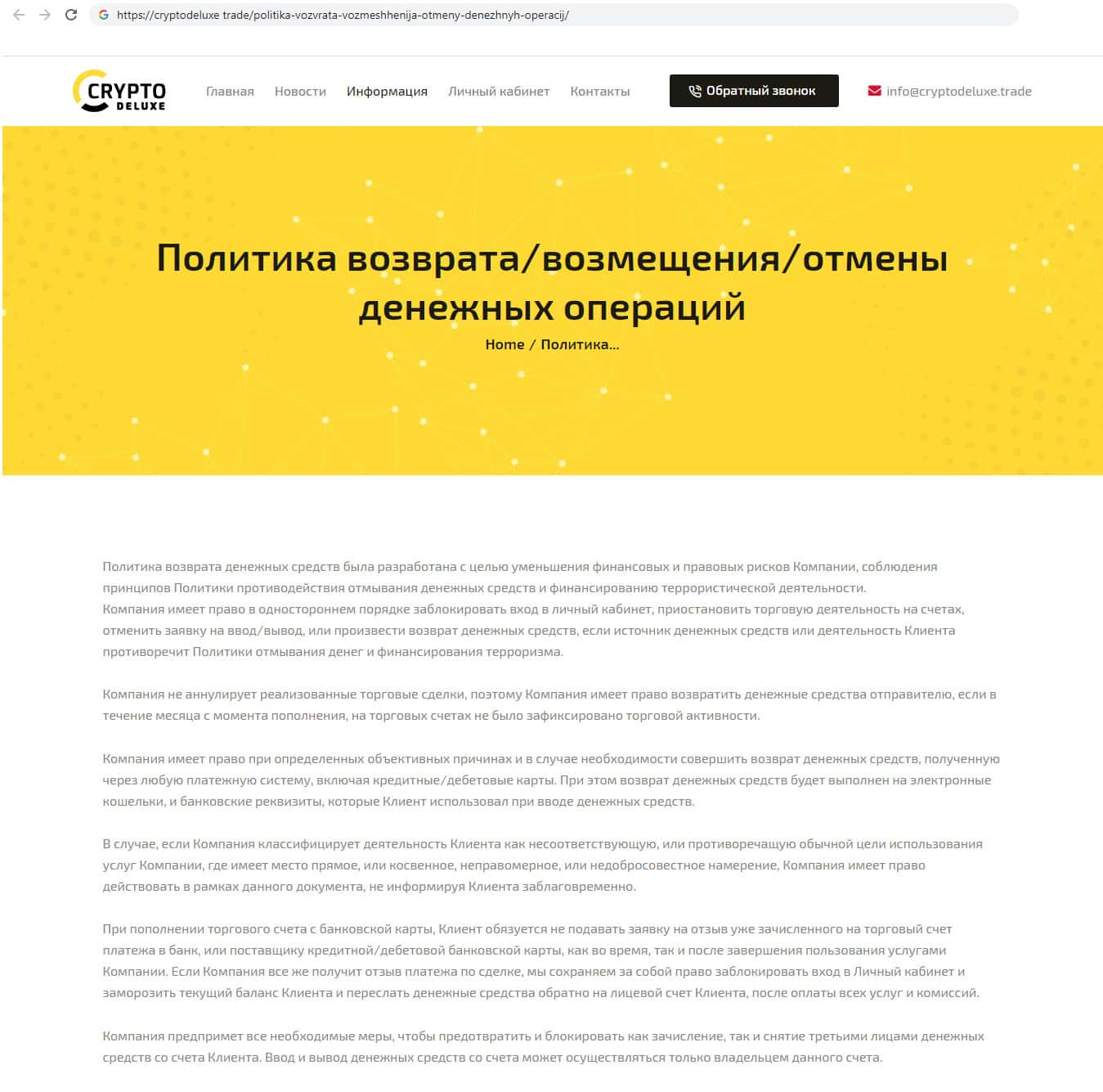 - Политика возврата средств от лохотрона Крипто Делюкс