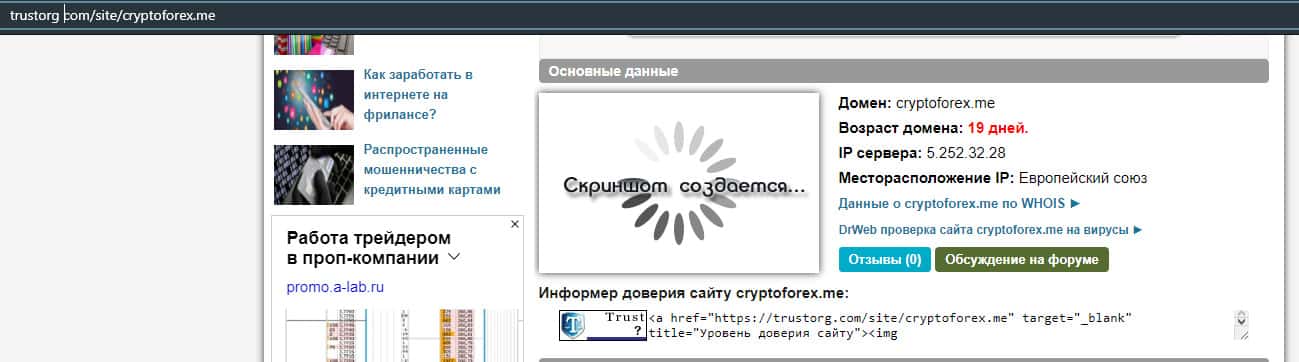 Как мы видим из стороннего ресурса, где можно провести анализ домена любого сайта, сайт конторы Crypto Forex на момент написания статьи существовал всего-то 19 дней. С такими процентами, которые они предлагают своим клиентам, лохотрон проживет еще не больше месяца, поэтому остерегайтесь этого лже-хайпа.