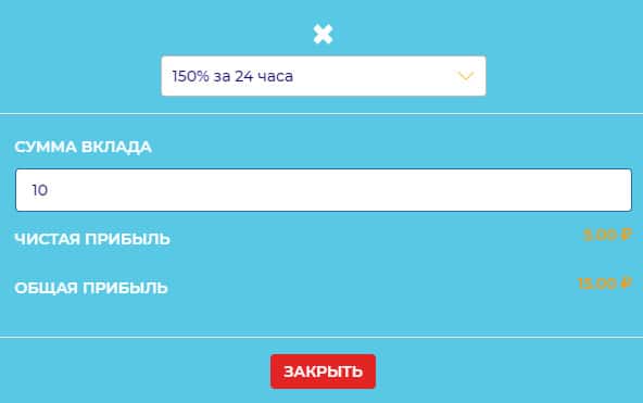 Вот ниже представлен калькулятор, где показывается, что с суммы вклада в 10 рублей в мошеннический хайп Crypto Forex, каждый клиент получит общую прибыль в размере 15 рублей. И все это за один день. Это конечно колоссальные проценты и данный лохотрон с такими предложениями проживет еще не больше месяца.