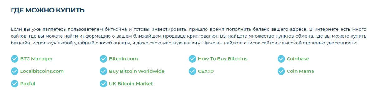 Ниже представлен перечень партнеров лохотрона Crypto Forex, которых он рекламирует для того, чтобы получить за это вознаграждение. Они называют это рекомендациями, где можно купить биткоины. Это такие проекты как: BTC Manager, Localbitcoins com, Paxful, Bitcoin com, Buy Bitcoin Worldwide, UK Bitcoin Market, How To Buy Bitcoins, CEX:10, Coinbase, Coin Mama.