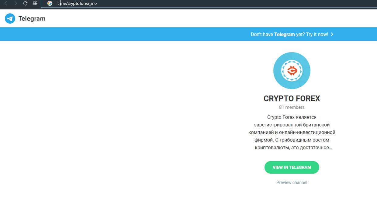 Как и все хайпы, мошенническая контора Crypto Forex заботится о том, чтобы привлекать внимание как можно большую аудиторию, ведь в этом заключается их заработок. Задачу решили с помощью социальных сетей. Шарлатаны организовали канал в Телеграм, где ведут свою деятельность по привлечению лохов и смогли пока набрать только 81 участников.