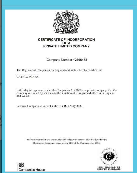 Что касается регуляции деятельности мошеннической организации Crypto Forex, то здесь уже нечего сказать, так как аферисты указывают на своем сайте вместо лицензии, документ об основании компании. Он конечно же не дает никакого права им вести инвестиционную деятельность, поэтому контору Крипто Форекс можно назвать нелегальной.