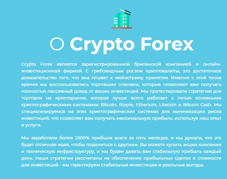 Далее представлена информация, которая взята с официального сайта лохотрона Crypto Forex, где каждому клиенту пытаются втереть в голову, что можно зарабатывать с ними без проблем. Схема простая как пять копеек: зарегистрировался, вложил денег, и все вывел. Сколько протянет такой хайп - непонятно, но лучше всего не рисковать с вложениями.
