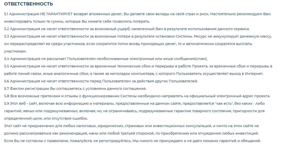 Ну и конечно же ответственность, которую жулики Крипто Форекс не хотят нести ни при каких обстоятельствах. Также администрация сайта не гарантирует возврат вложенных средств и вы делаете все вклады на свой страх и риск. Мошенники не несут ответственности за технические сбои, которые могут привести клиента к убыткам.