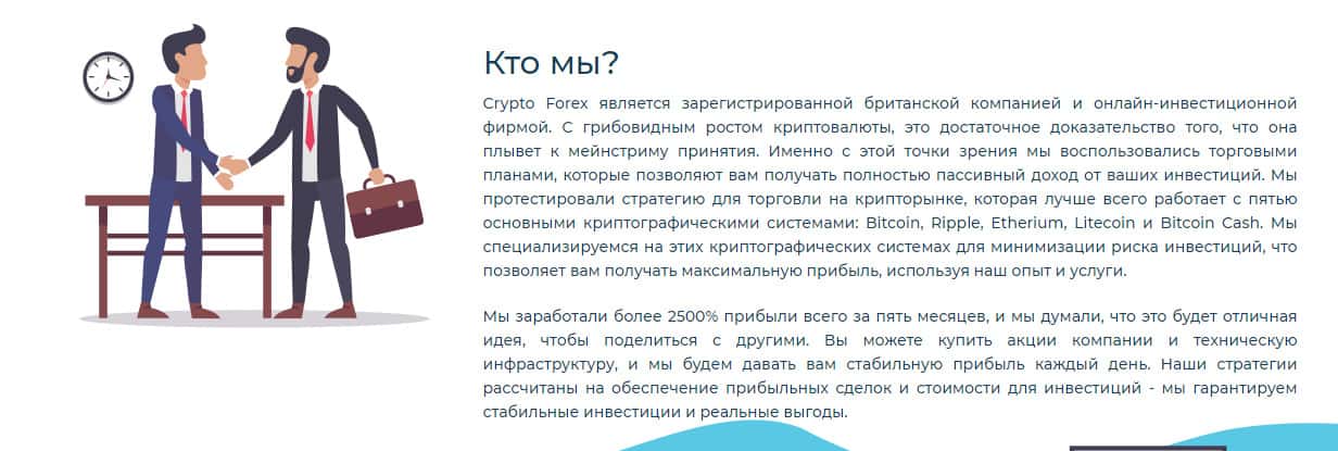 Как отвечают на вопрос по поводу "Кто они?", лохотронский хайп указывает, что Crypto Forex является зарегистрированной британской компанией и онлайн-инвестиционной фирмой. Но в тоже время нет никакой конкретики касательно основателей, руководства, да и просто персонала. Как кого зовут и где работают - жулье не указывает.