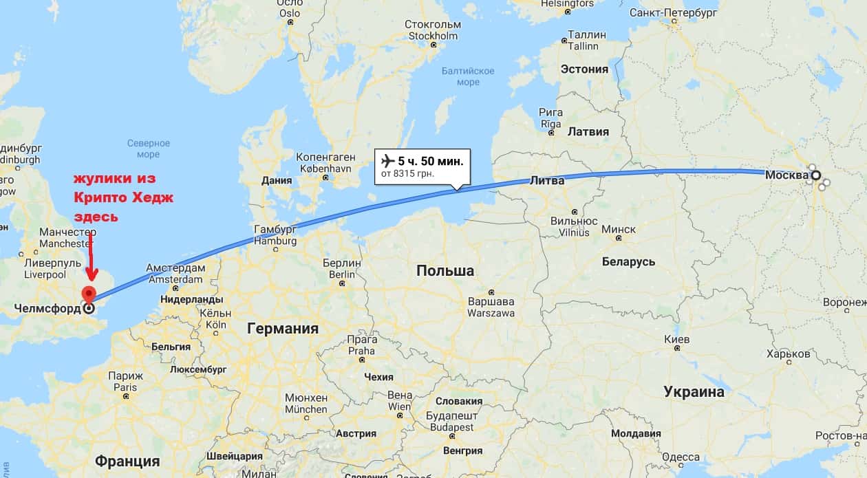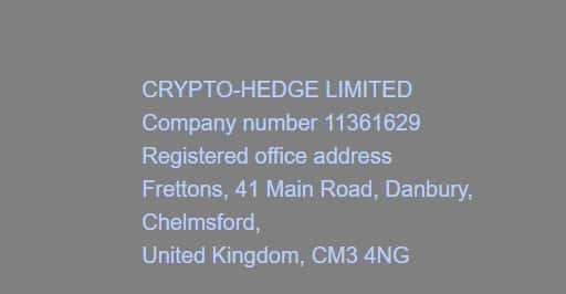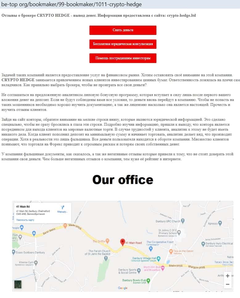 На мошенническом сайте конторы Крипто Хедж указан адрес офиса в Великобритании, город Челмсфорд. Возможно, он фальшивый, как и сама финансовая организация.
