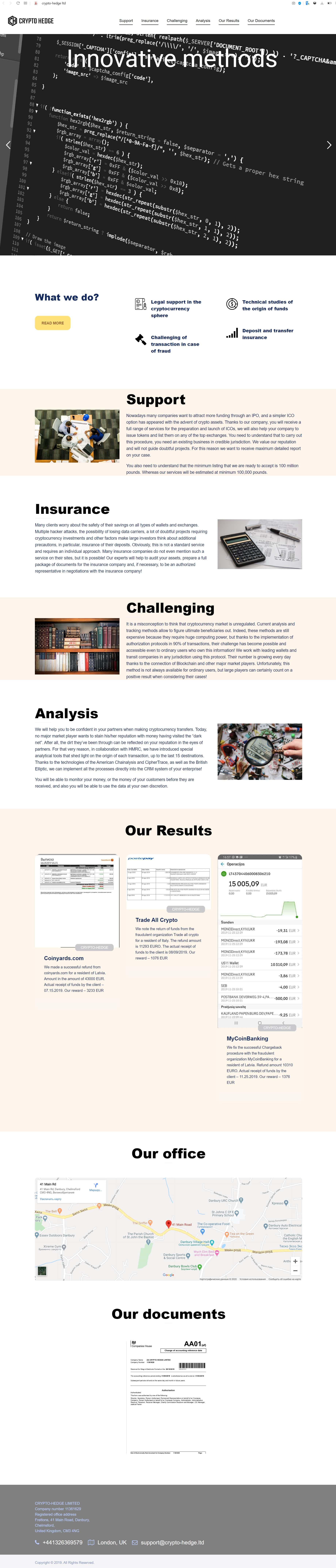 Сайт финансовой компании Crypto-Hedge Ltd представляет собой жалкий одностраничник с огромным количеством абсолютно пустой информации. Сразу видно, что это лохотрон.