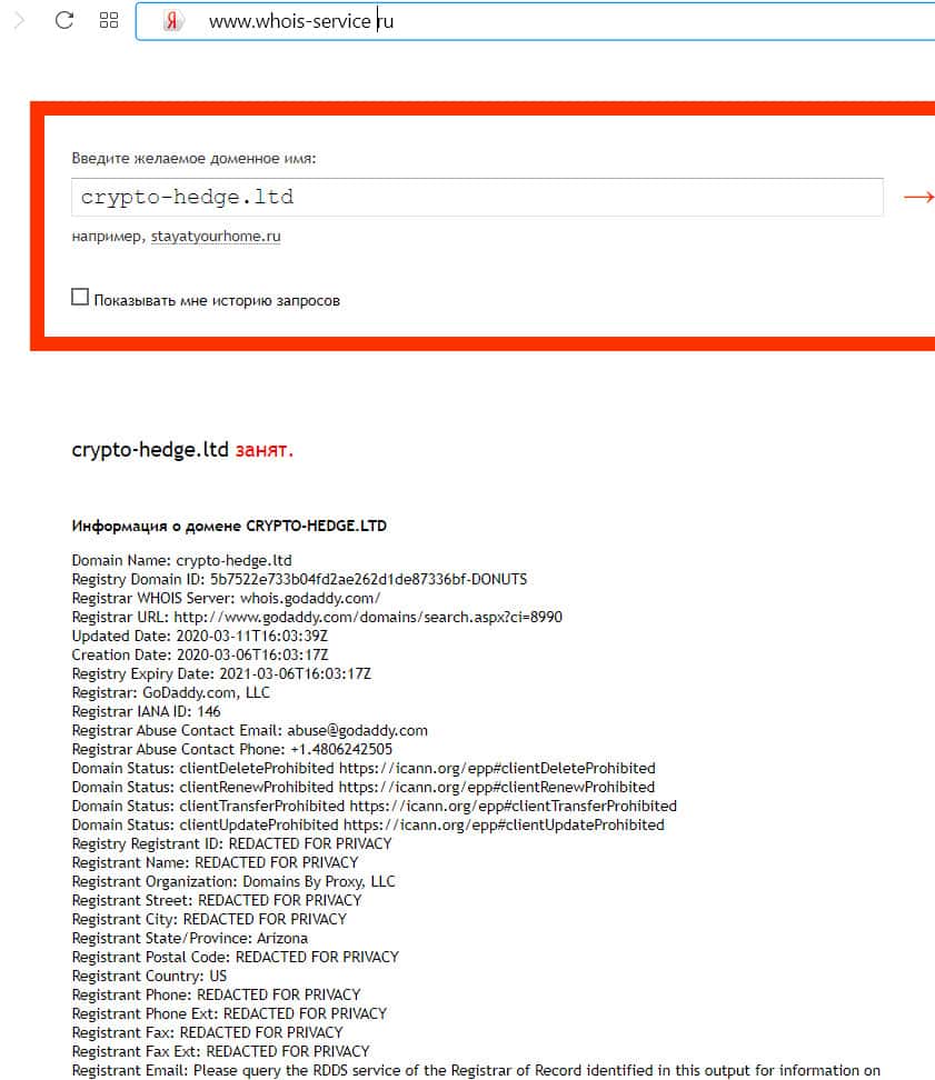 - Кому принадлежит доменное имя компании Crypto-Hedge Ltd?