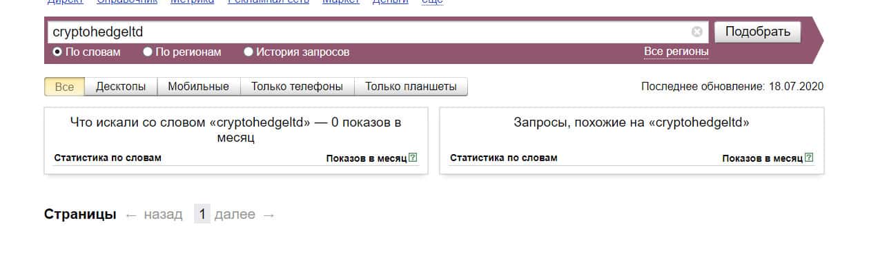 Название бренда "cryptohedgeltd"на английском языке пользователи не искали в системе Яндекс, результат нулевой.