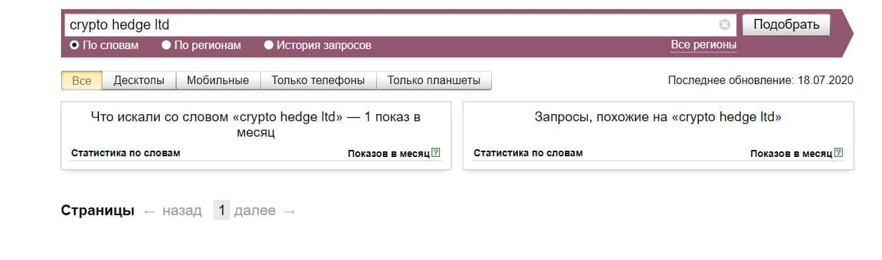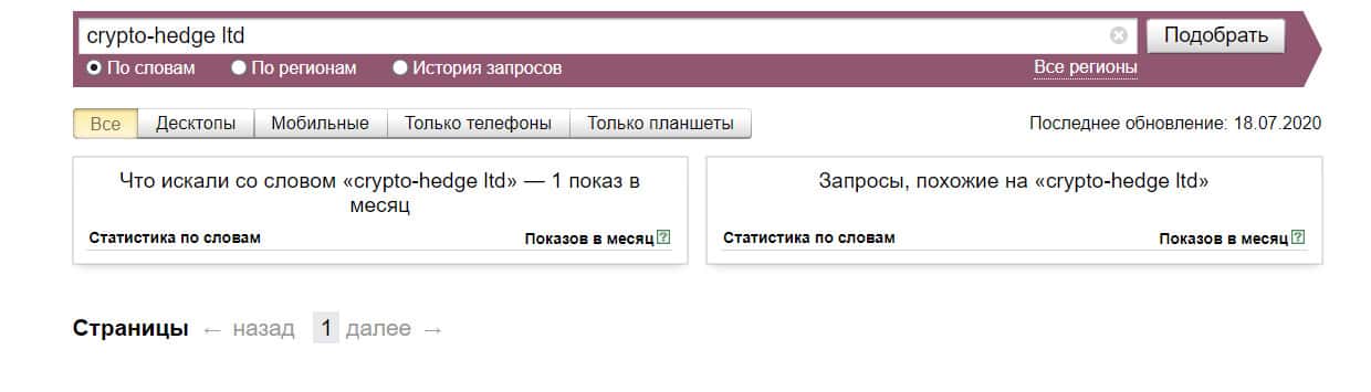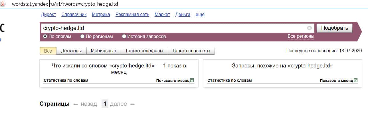 Количество пользователей, желающих найти сайт "crypto-hedge ltd" без точки с пробелом в системе Яндекс не изменилось - снова всего один человек.