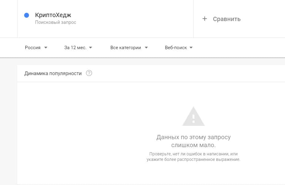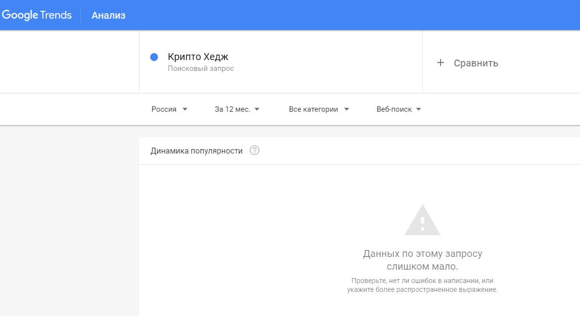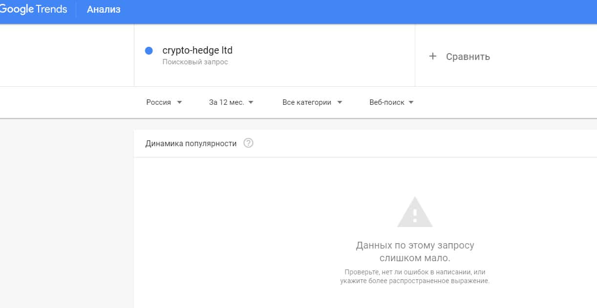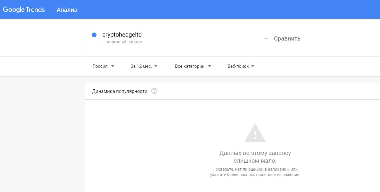 Посмотрим, какое число людей, интересовавшихся чарджбеком, вбивали название "crypto hedge ltd" в поисковую строку Гугл. Очень мало данных для обработки запроса.