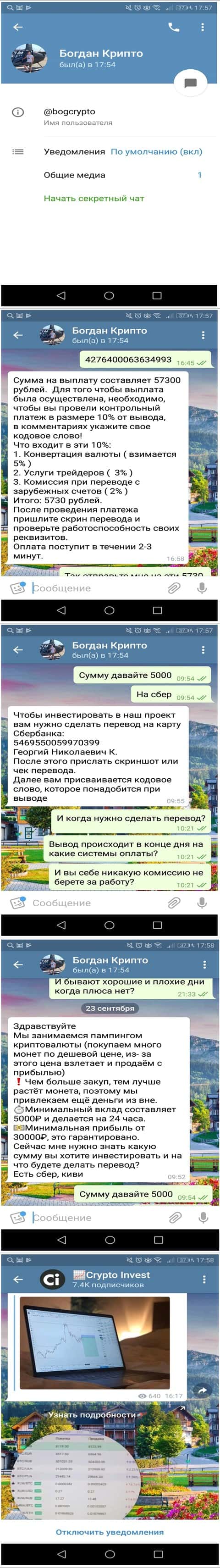 Аферисты теперь захватили еще один новый рынок - рынок криптовалют. Среди них ведет активную деятельность контора под названием Крипто Инвест, которая облапошивает клиентов. Жулье развело наивного человека на 5 000 рублей, так как думал, что заработает легкие деньги на памп-инвестициях, но получилось наоборот - это памп-инвестиция нагрела его. В любом случае деньги остались у хозяина лохотрона, который просит теперь заплатить 10 процентов от суммы заработка. Все действие ведет некий жулик по имени Богдан, он то и пытается кинуть свою очередную жертву. Но не смотря на это человек осознал и понял, что заплатил жизненной ситуации за опыт, который в дальнейшем убережет его от подобного рода афер. А жуликам можно сказать - живите пока можно!