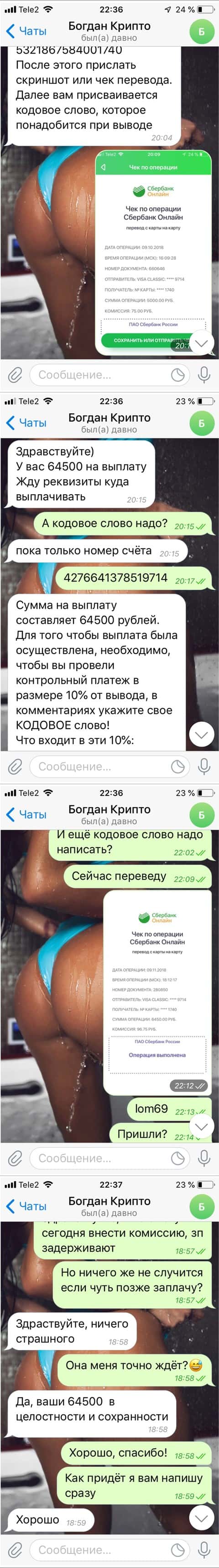 И напоследок представляем вашему вниманию чеки переводов средств на счета мошенников CrypInvest и переписка с самим шарлатаном Богданом Крипто.