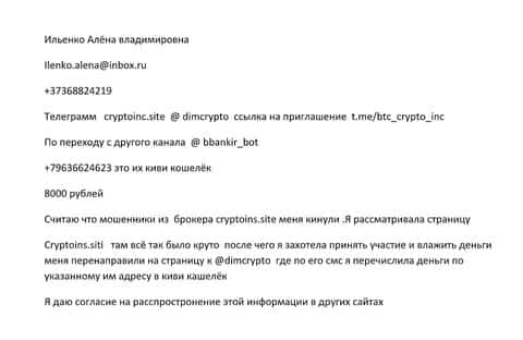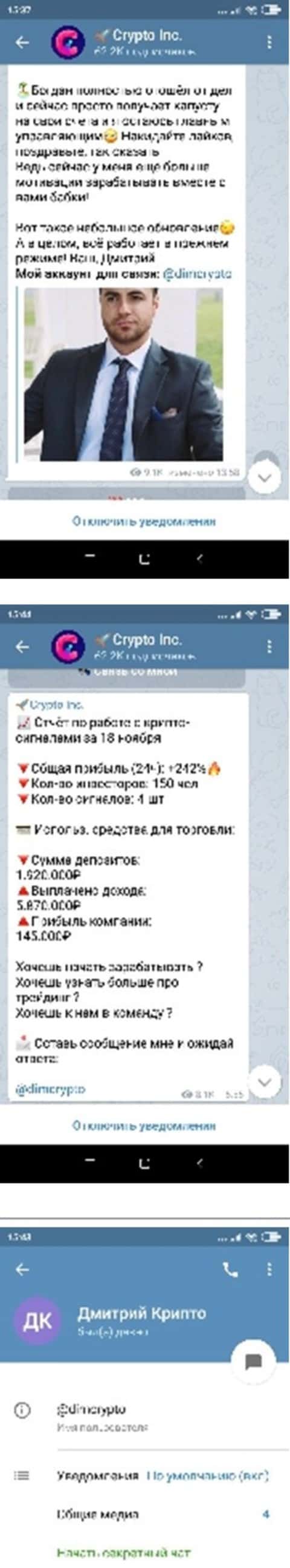 Большинство людей присылают нам письма со словами "жаль что я не нашла вас раньше" и соответственно прикрепляют жалобу. На этот раз жалоба пришла на криптоконтору CrypInvest и автор письма описывает историю, как Дмитрий крипто в группе телеграмм, ловко развел женщину на 7000 рублей. Как указано в истории, да и в прочих подобных схемах, человек вкладывает деньги, через сутки набегает липовая сумма, а потом чтобы вывести все нужно заплатить 10% от суммы. Благо что женщина включила голову и не повелась дальше на развод. Единственное что смущает, это то, что деньги переводились через криптовалютные кошельки и вряд ли теперь можно повлиять на возврат средств.