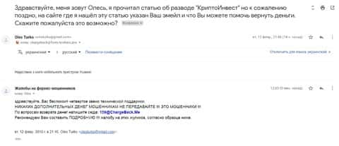 Далее представлены скриншоты, которые доказывают процесс выманивания денег аферистами кухни Крипто Инвест.