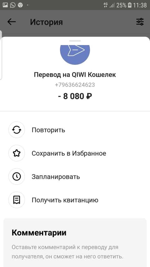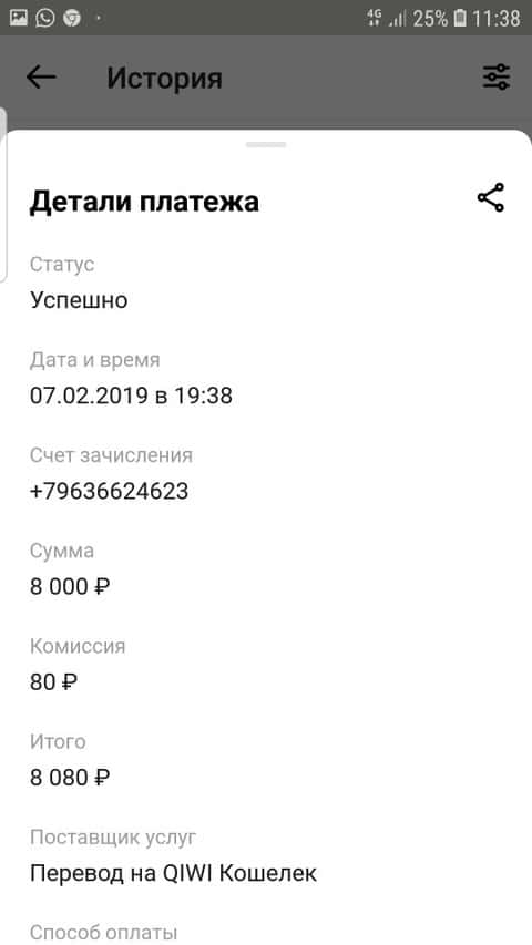 Ну а это сама транзакция на 8000 рублей, которая показывает перевод денег на счет шарлатанов CrypInvest.