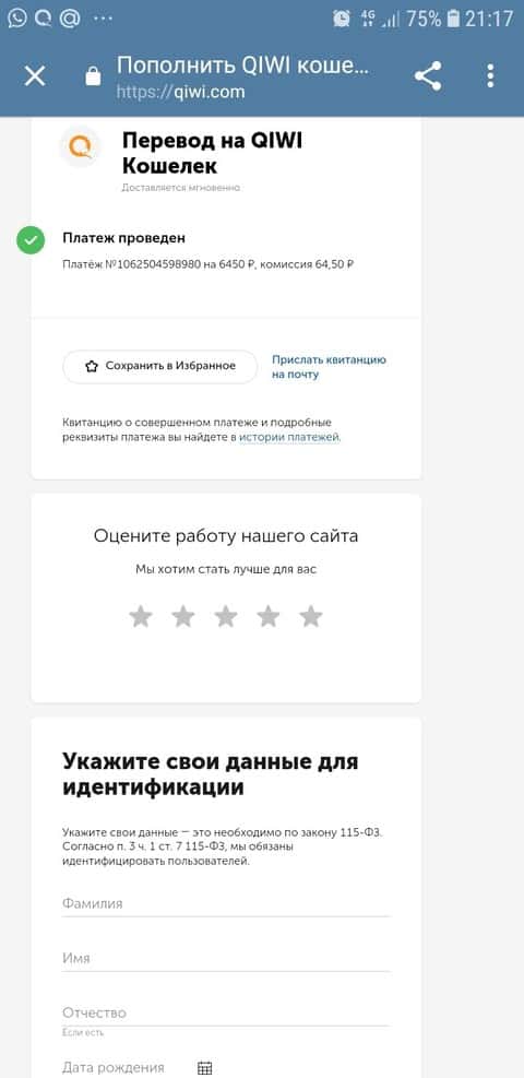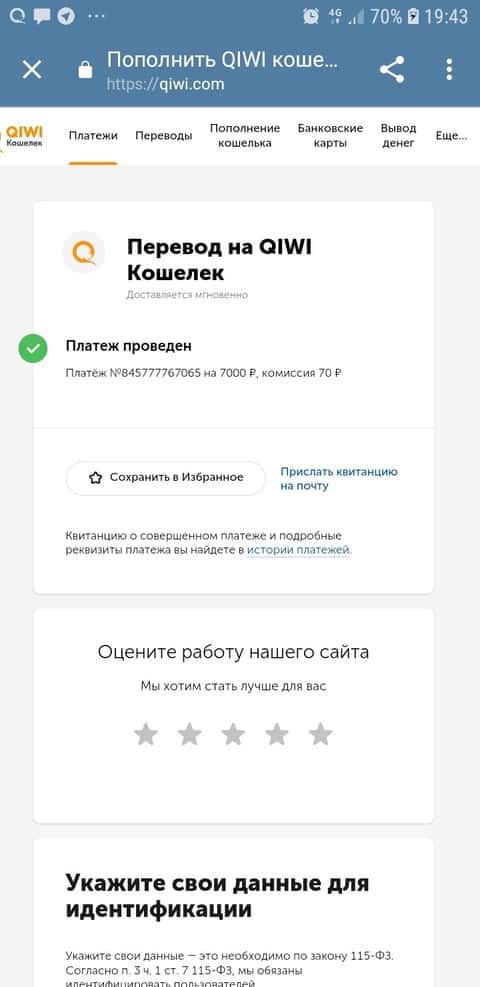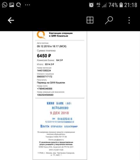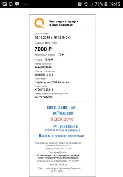 Вот такую вот квитанцию на сумму 7000 рублей прислала платежная система Qiwi, после того как он отправил деньги жулью CrypInvest.