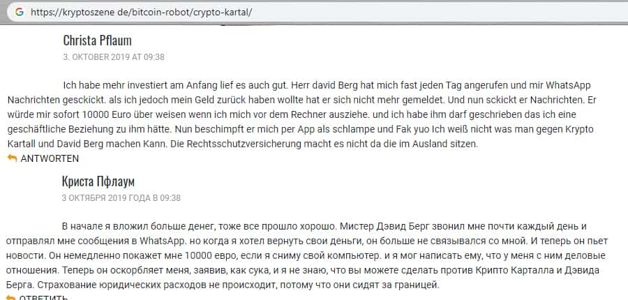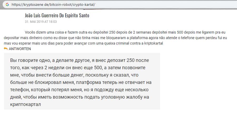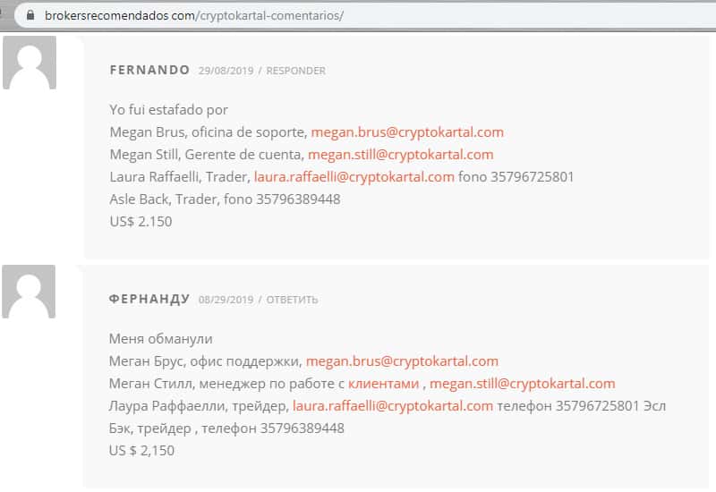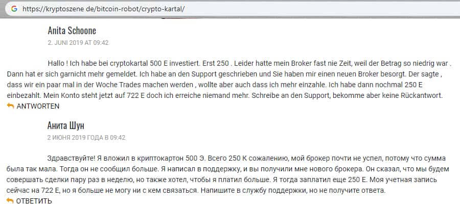 Новый гневный комментарий трейдер оставил на просторах одного из интернет ресурсов. Пользователь утверждает, что мошенники Крипто Картал выманивали деньги и после игнорировали. После чего, ему предоставили нового брокера, но и там, после вклада, его снова игнорировали, а учетную запись и вовсе заморозили.