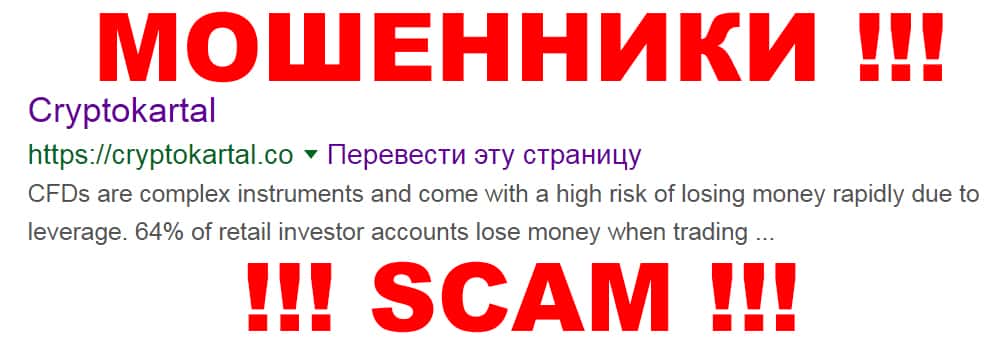 Cryptokartal - шарага разводящая Вас, заставляя вкладываться в разные валютные рынки. Стандартные схемы развода трейдеров на деньги из-за довольно популярной темы с криптовалютами. Мошенники предлагают Вам инвестировать в рынки и, в конце концов кидают, не отвечая на запросы и жалобы. Кроме того, присутствует шантаж. Не ведитесь на этот дешевый развод.