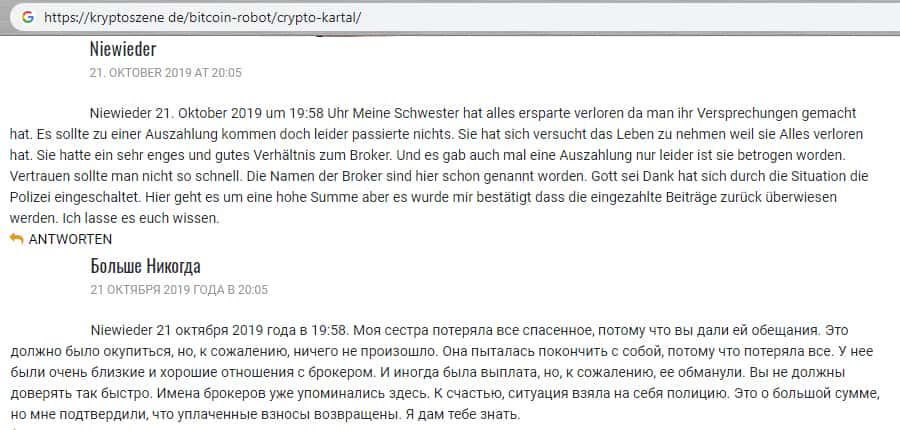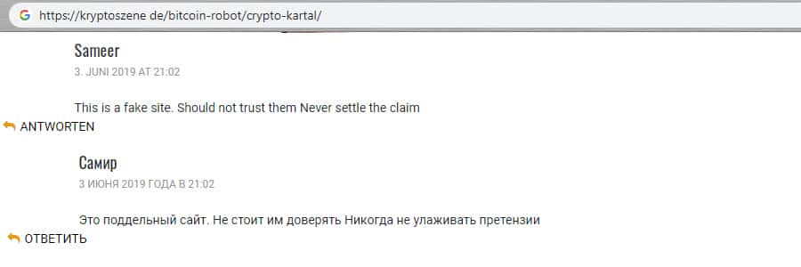 Так выразился трейдер, поработавший с мошенниками Crypto Kartal, на популярном иностранном сайте. Юзер рассказывает о том, что сайт поддельный и что не нужно им доверять. Кроме того, он подметил, что мошенники не улаживают претензии поступающие от пользователь, на них тупо забивают. Стандартные схемы воров чужого добра.
