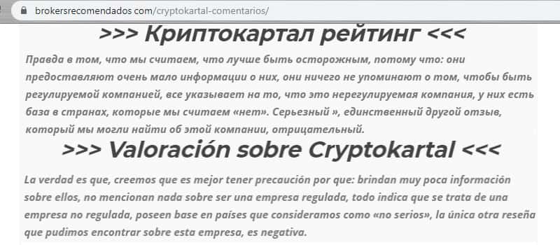 Не очень хорошее мнение у одного из сайтов за границей. Авторы сайта не рекомендуют Crypto Kartal из-за того, что: информации о конторе нет, конкретного местонахождения нет, есть только информация о том, что они зарегистрированы в США, состоят в списке "не серьезных" брокерских фирм, и в конце концов - куча гневных комментариев.