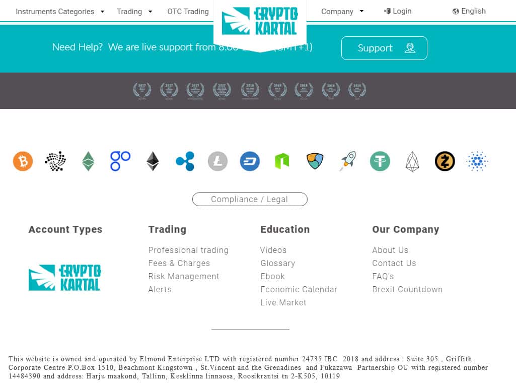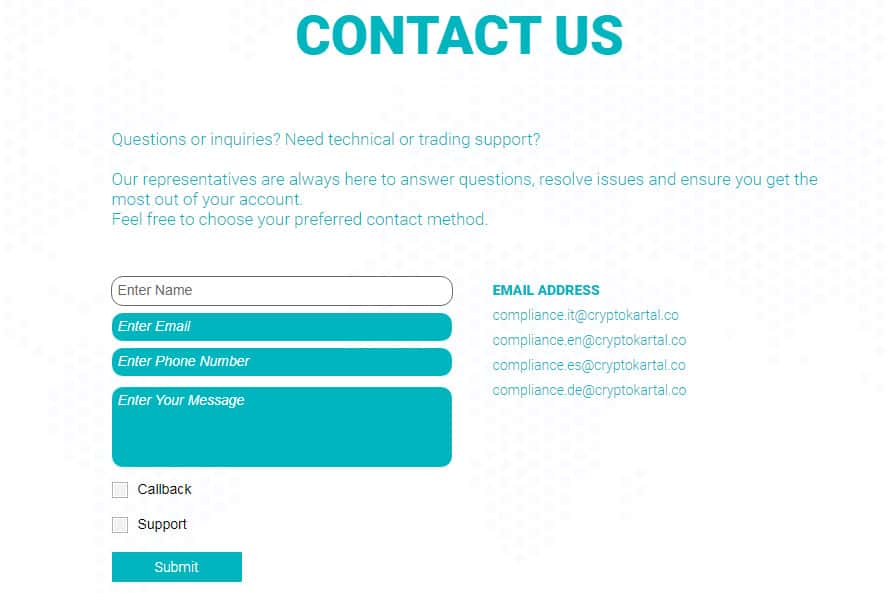 - электронные почты compliance it@cryptokartal co, compliance en@cryptokartal co, compliance es@cryptokartal co, compliance de@cryptokartal co.