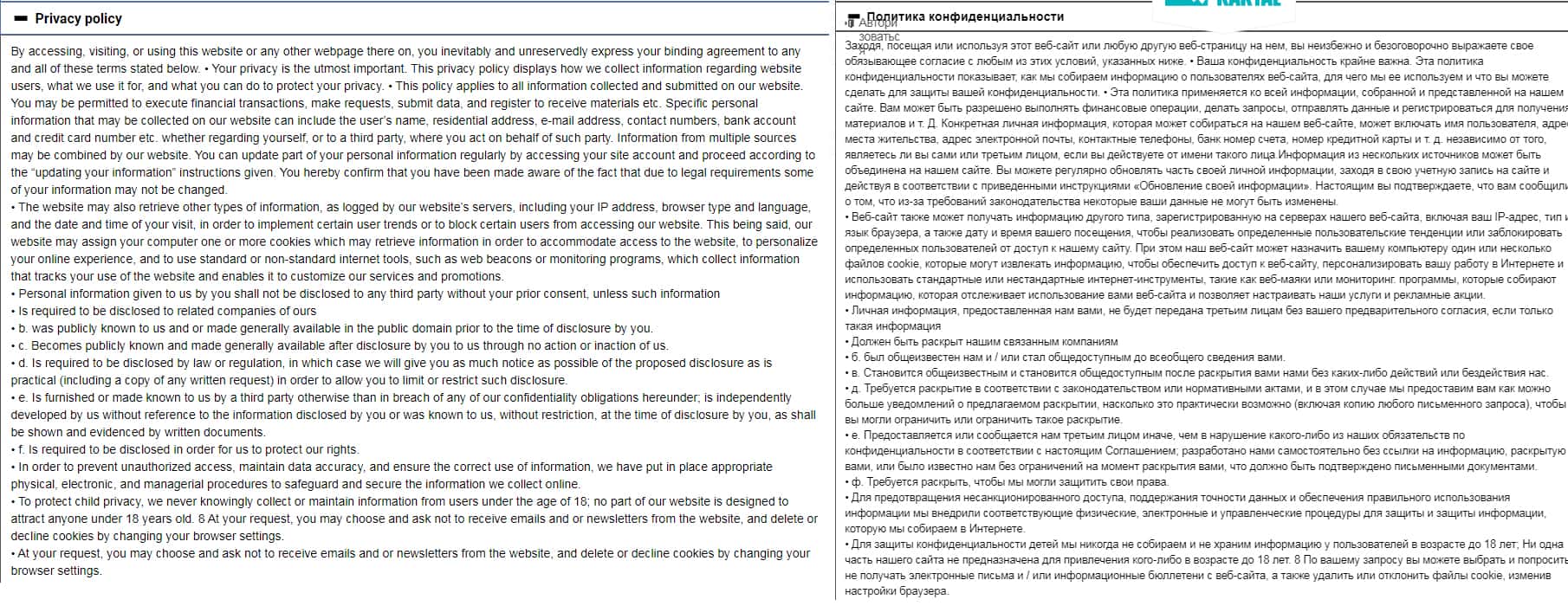 При отсутствии лицензии и клиентского соглашения, контора CryptoKartal выдвигает свои претензии по поводу политики конфиденциальности. Мошенники заставляют трейдеров говорить свои данные, под предлогом конфиденциальности, и отсутствием передачи третьими лицами. Но никто, естественно этого не обещает.