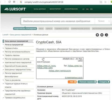 Общество с ограниченной ответственностью "CryptoCash" зарегистрировано в Латвии с "огромным" уставным фондом в 2800 евро в марте 2018 г. Предоставляя услуги по операциям с криптовалютами на конец 2018 года ООО заплатило 4,8 Евро в бюджет Латвии. Как скрывают мошенники свои доходы - это вопрос для налоговой администрации Латвии. Нас больше интересует их деятельность в Интернет.