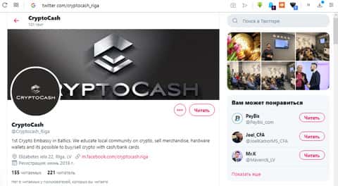 Проплаченные отзывы на фейсбук - пиар мошенников КриптоКэш.Аналогично аккаунт и на Твиттере. Твиты в большей степени носят рекламный характер, и в меньшей информационный. Информация представлена в общем виде, никакой конкретики, никаких колебаний курсов криптовалют, сплошная вода. Общее количество подписчиков 221.