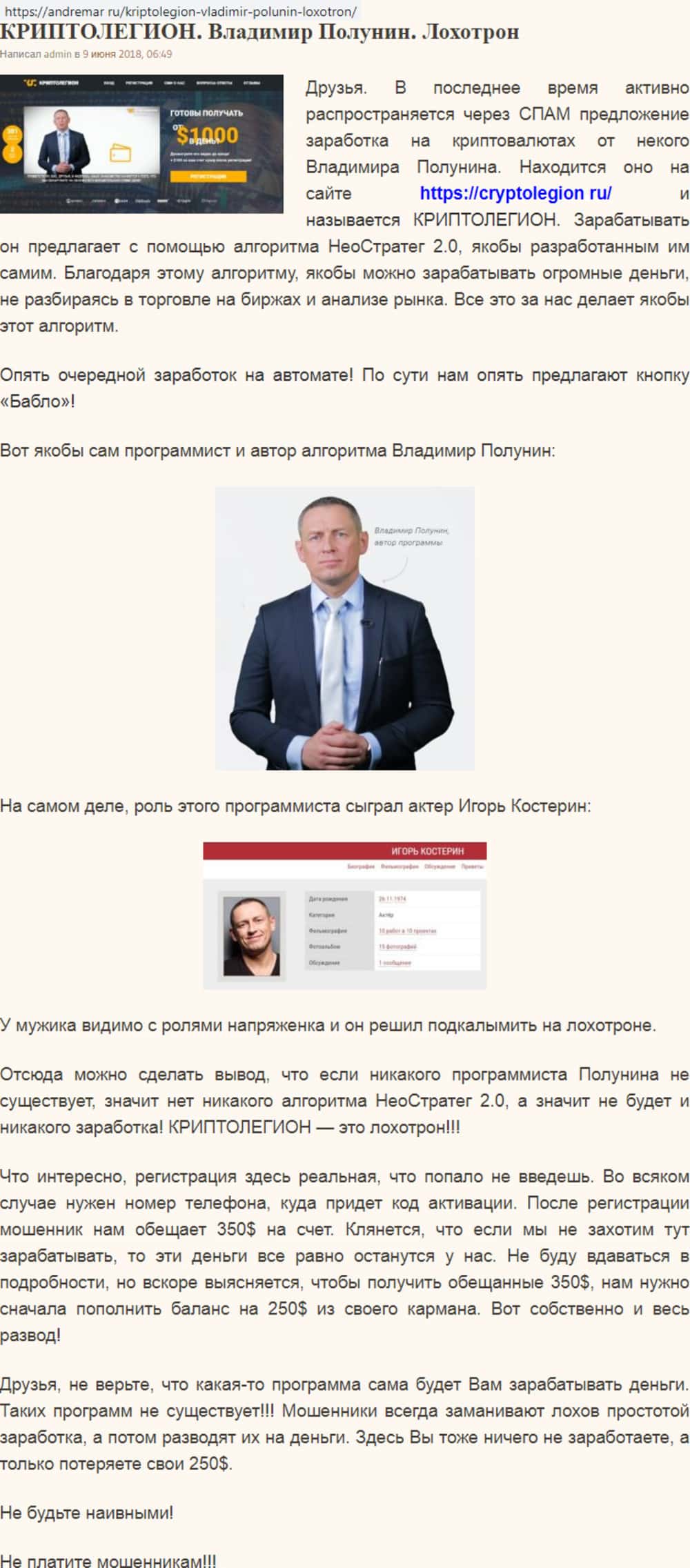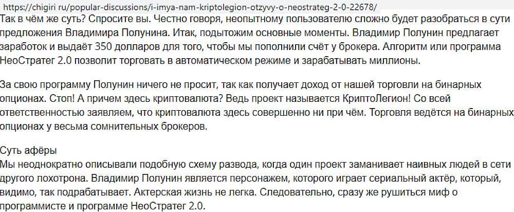 На страницах онлайн-ресурса boexpert ru вступили в полемику двое участников, обсуждая человека, который якобы является автором недопроекта Крипто Легион. Жулики Крипто Легион наняли актера, который исполнил роль так называемого создателя чудо-программы. Мать одного из пользователей поверила речи этого артиста и лишилась 250 долларов.