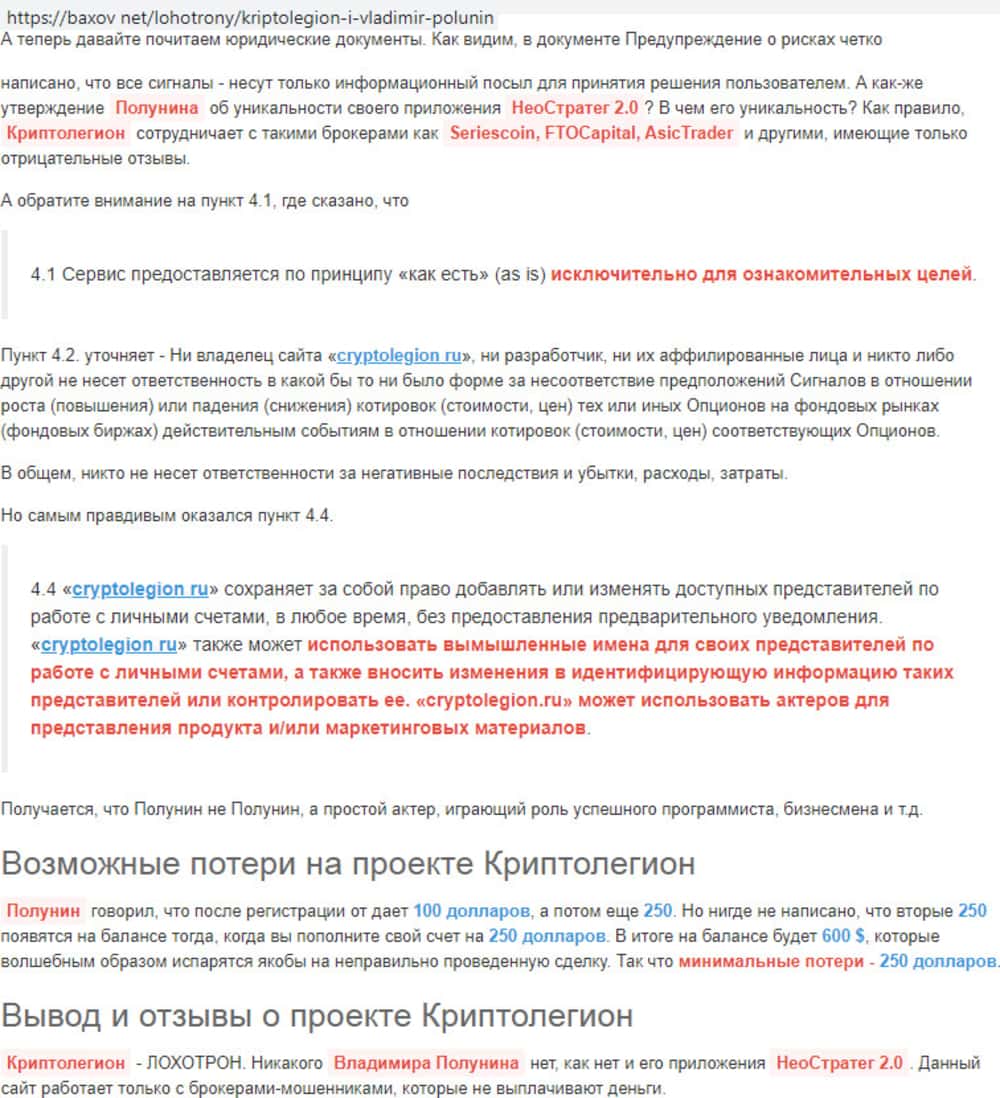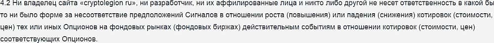 Сами бинарные каталы CryptoLegion снимают с себя ответственность за все, включая и обещанный ими 100% прогноз, который позволит зарабатывать миллионы. Фактически вместо полезной информации о предположениях движения рынка, трейдеры, рискнувшие поучаствовать в афере CryptoLegion, получают полнейшую выдуманную чушь.