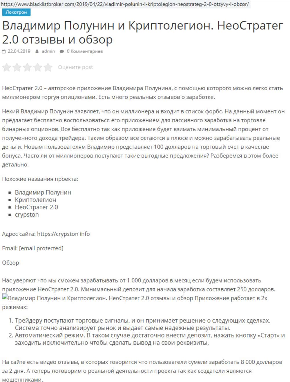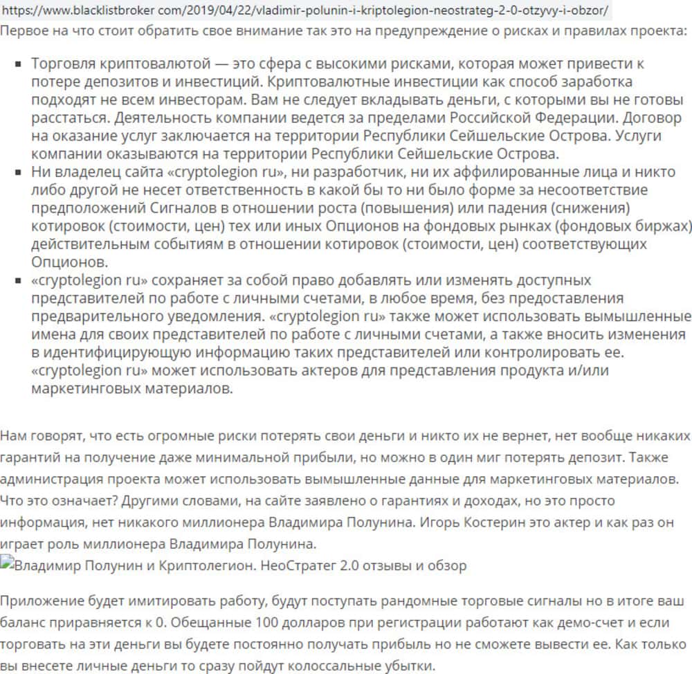В итоге имеем совершенно дутый махинаторский проект CryptoLegion, который состоит из фиктивного программиста-актера, несуществующей программы НеоСтратег 2.0 и сброда дешевых псевдоброкеров, которые только и ждут очередных вкладов от доверчивых пользователей собирающихся приобщиться к онлайн-торговле.