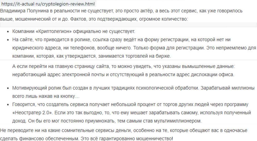 Независимый обозреватель - портал it-actual ru осветил гнилое нутро лохотрона CryptoLegion на своих страницах. Аферисты CryptoLegion предлагают практически ничего не умея и не делая, грести деньги лопатой с помощью придуманного ими якобы торгового робота, которого перед этим нужно зарядить деньгами. Конечно же это обычный развод.
