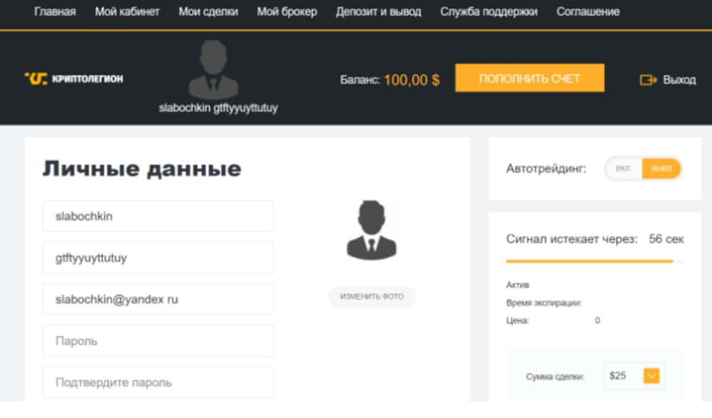 При регистрации на пластилиновом сайте разводил CryptoLegion необходимо вводить некоторые личные данные. Номер телефона необходим обязательно, причем какой попало не подойдет. Нужно это для того, чтобы потом надоедливые псевдоменеджеры лохотрона CryptoLegion начали названивать и разводить на кредиты для пополнения счета.
