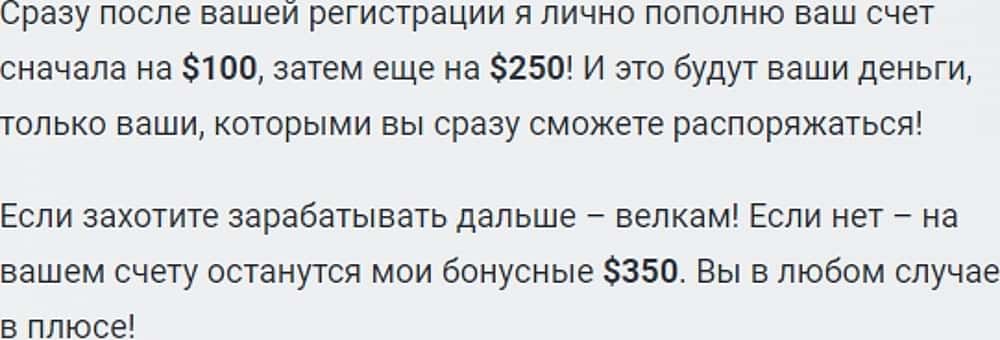 За регистрацию на хайп-проекте Крипто Легион, его липовый создатель обещает два бонуса 100 и 250 долларов, которые по его заверениям останутся в распоряжении трейдера навсегда. На самом деле криптошакалы для его вывода запрашивают пополнение на 250 долларов США. Конечно же они уйдут в карманы мошенников, а бонус лишь уловка.