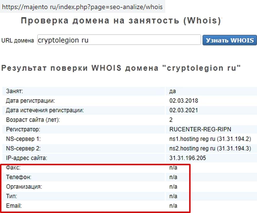 С помощью сервиса Whois, который предоставил комплексны анализатор majento ru, удалось узнать, что вся информация о владельце доменного имени разводного проекта CryptoLegion скрыта. Самому лохотрону всего два года, но за это время он уже успел изрядно опустошить много кошельков доверчивых пользователей сети Интернет.