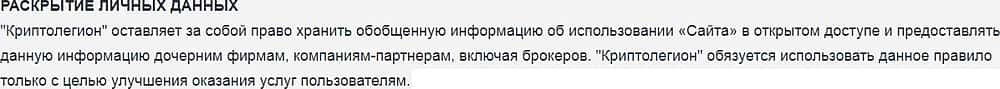 Онлайн-шалопаи Крипто Легион видимо против использования политики конфиденциальности, если раздают личные данные направо и налево. Ваша персональная информация может оказаться в лапах неких дочерних фирм, компаний-подельников и прочего внебиржевого мусора о котором на самом недоресурсе Крипто Легион ничего не сказано.
