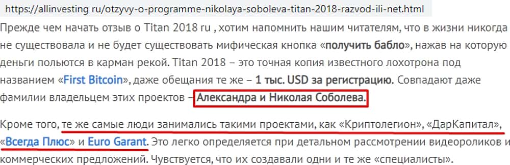 Информативный видеообзор предложил один из внимательных пользователей сети. Как оказалось, провальный проект Крипто Легион не действует сам по себе. Мошенники слепили еще проекты клоны этого безобразия: Всегда+, ДарКапитал, Euro Garant Technologies и Auto-Btc. Все эти лохотроны - разные личины одной громадной аферы.