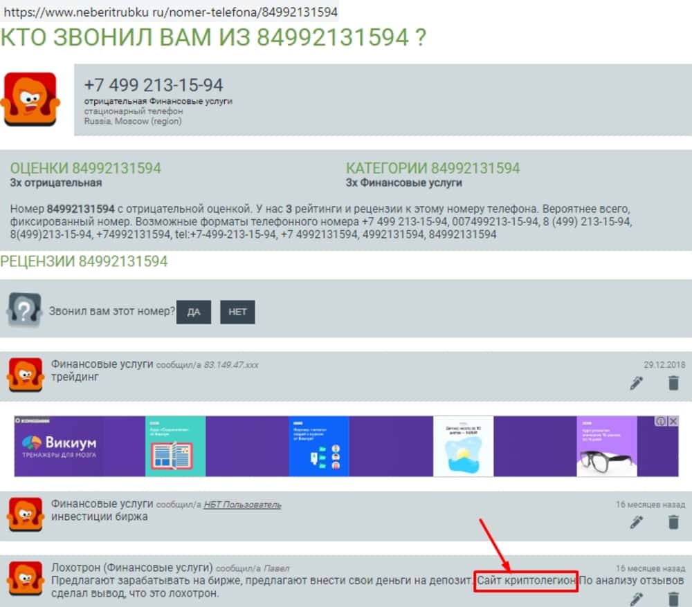 На одном из порталов для проверки номеров телефонов, удалось обнаружить номер, который принадлежит мошенникам Крипто Легион. На звонки с данного телефона были оставлены три негативные оценки и в одном из отзывов можно заметить, что указана даже звонившая контора. Это как раз и были аферисты Крипто Легион: