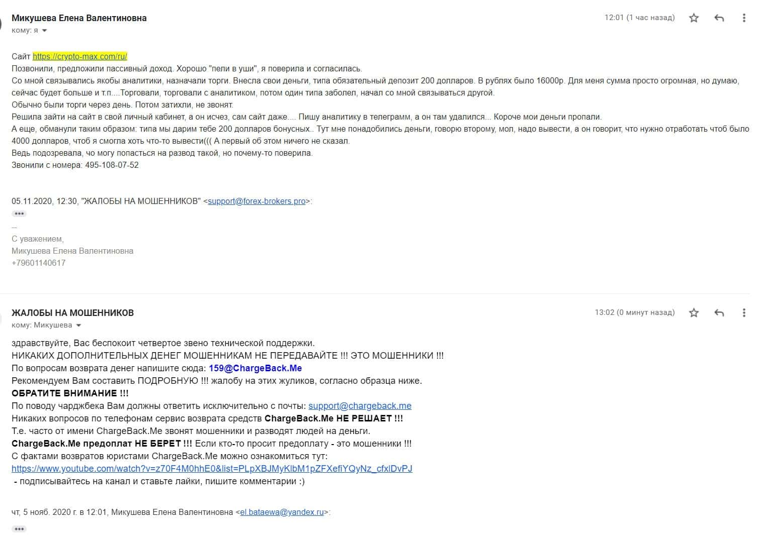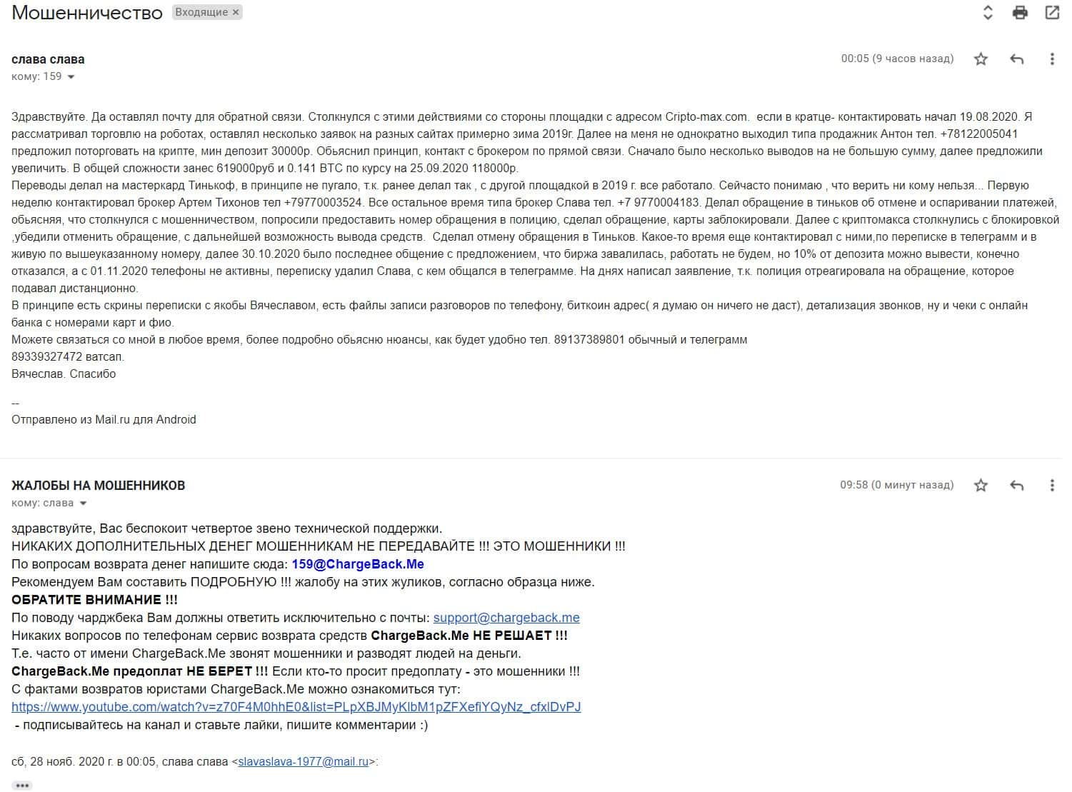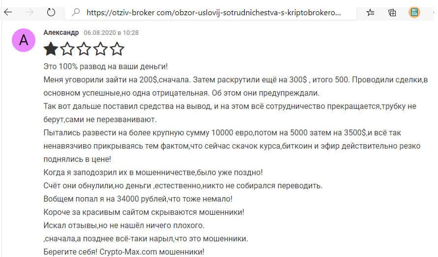 В данном разделе предлагаем ознакомится с информационным материалом в виде очередной жалобы от пострадавшего клиента мошеннической компании Крипто Макс.