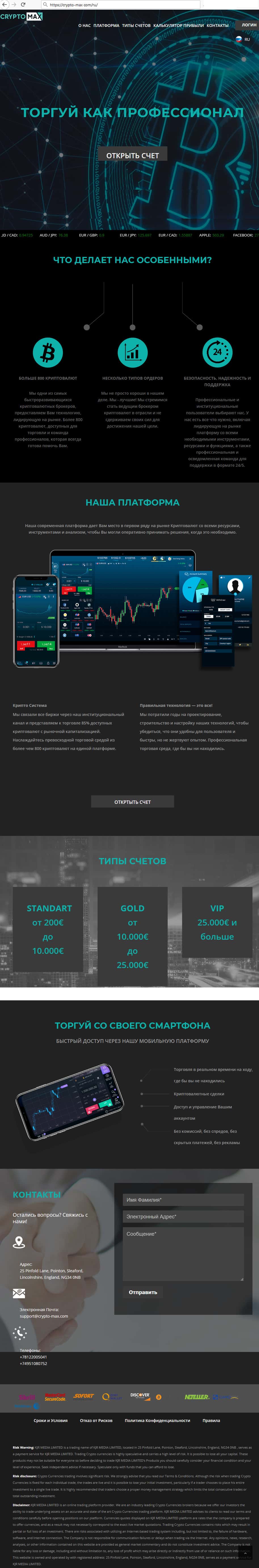 Крипто Макс - еще один псевдоброкер, который появился в толпе мошенников, предлагающих трейдерам поторговать на Форексе с помощью их платформы и обкрадывающий депозиты. Если в попытках подыскать ДЦ вы набрели на их сайт - даже не пробуйте регистрироваться, ведь при беглом взгляде видно, что перед вами кидалы!