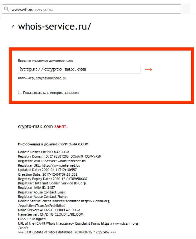 Полное наименование домена "crypto-max.com", написанное с точкой потенциальные жертвы в Гугл не искали.