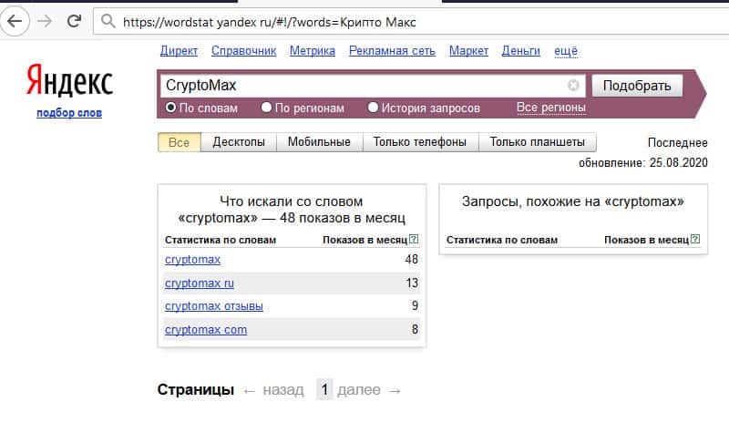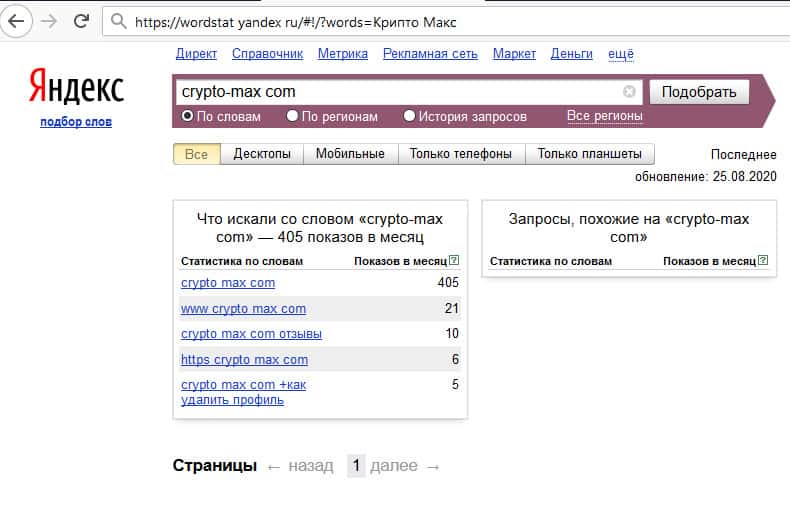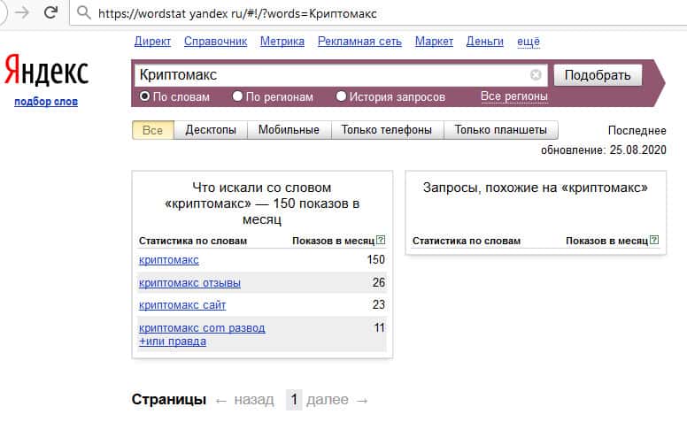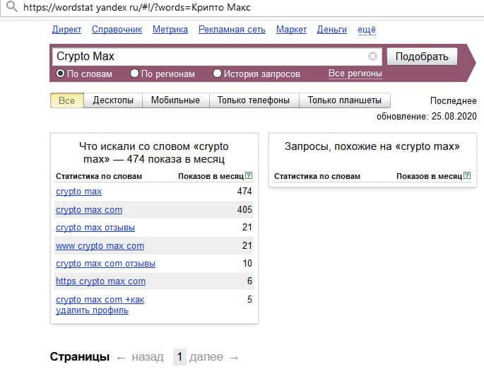 Как часто спрашивают о Крипто Макс в поисковике Яндекс?