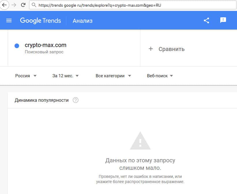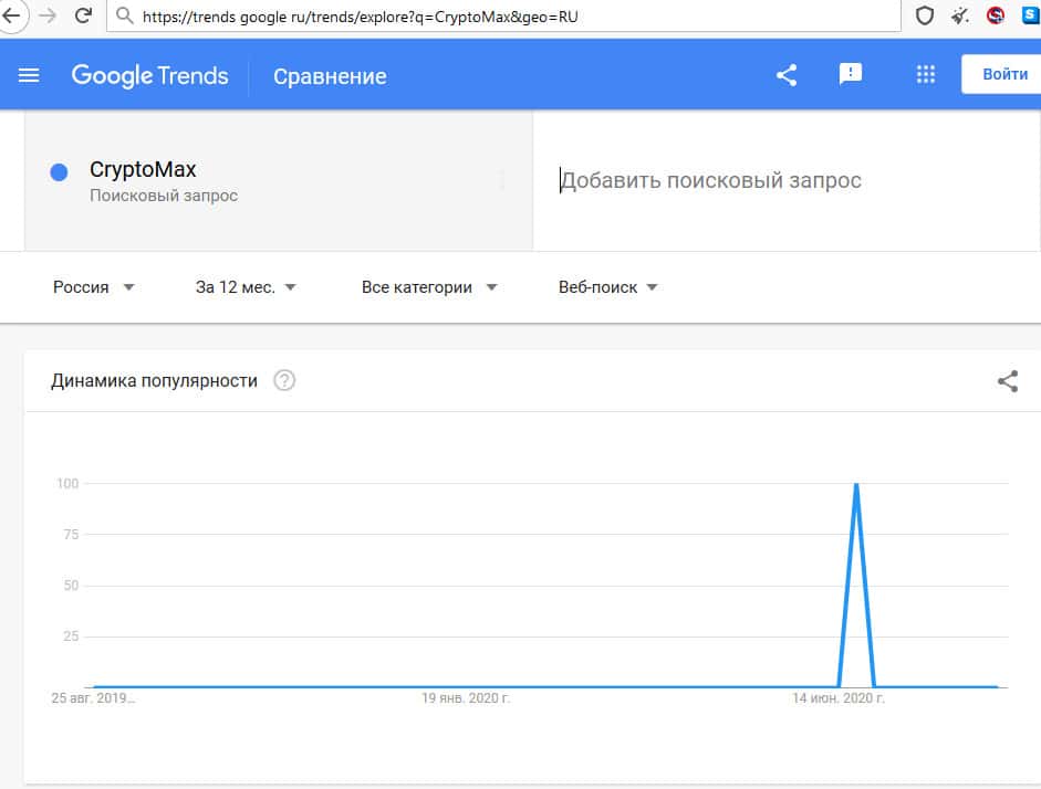 В поисковике Гугл наименование "Крипто Макс" в последнее время никто не искал, скорее всего его реклама где-то намозолила глаза русскоязычным трейдерам, предпочитающим Яндекс.