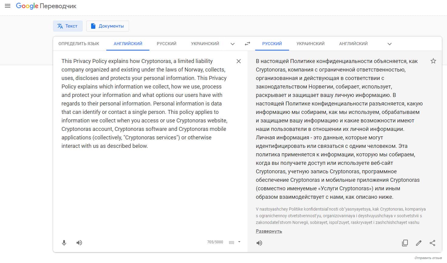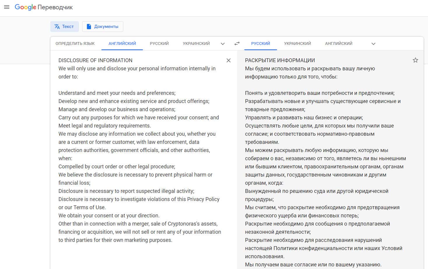 Перечень условий политики конфиденциальности аферистов Крипто Норас