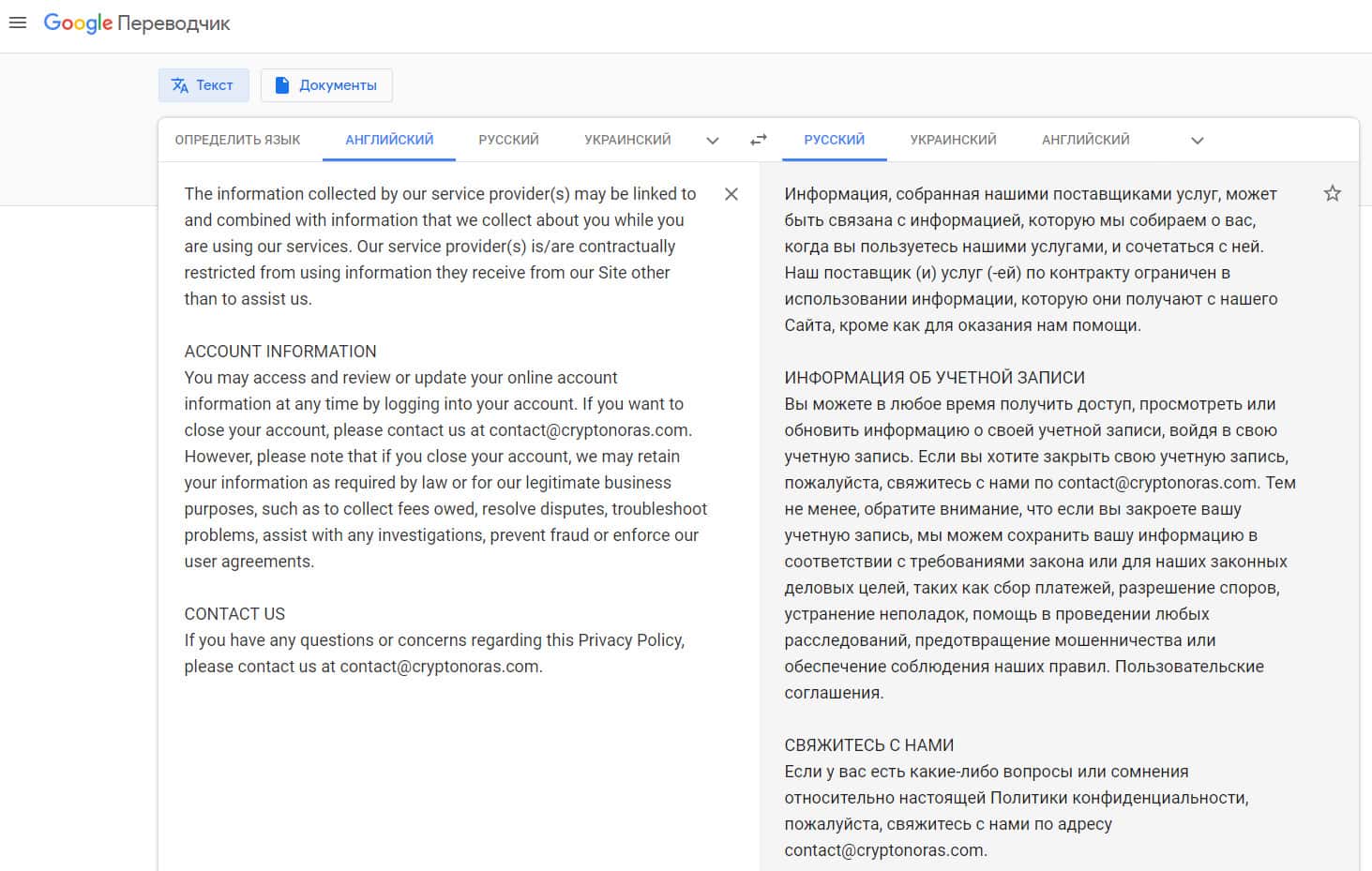 - Перечень условий политики конфиденциальности аферистов Крипто Норас